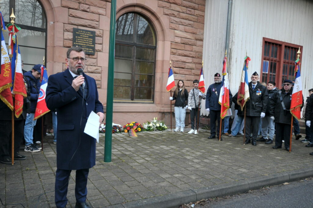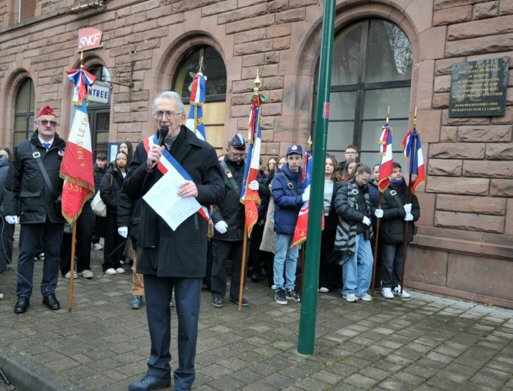 La cérémonie s’est ouverte à la gare de Rothau par un discours du maire, Marc Scheer, qui a tenu à rendre hommage et à remercier Brigitte Kahn à l’initiative de cette journée de commémoration. Il a rappelé la portée symbolique de ce lieu, dernier arrêt ferroviaire des déportés avant leur transfert vers le camp nazi de Natzweiler-Struthof.