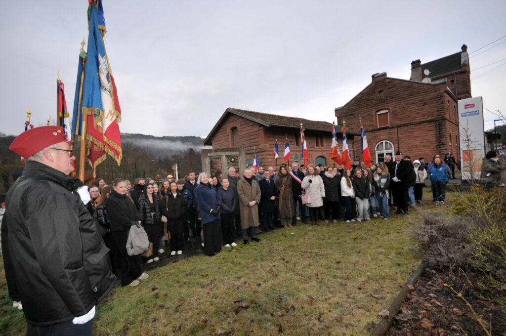 La présidente de l’association Regards d’Enfants, Frédérique Neau-Dufour, a ensuite pris la parole pour rappeler qu’en cette date nous célébrons la journée internationale de commémoration de la libération du camp d’Auschwitz-Birkenau. Plusieurs gerbes ont alors été déposées : par le Commissaire aux Droits de l’Homme accompagné d’élèves du collège Camille Schneider de Molsheim, par le consul d’Allemagne avec des élèves du collège André Maurois de Bischwiller, ainsi que par deux cheminots membres de l’Association nationale des cheminots anciens combattants (ANCAC). La cérémonie s’est poursuivie par l’interprétation de La Marseillaise entonnée par les élèves du collège Frison Roche de La Broque, reprise par l’ensemble des participants.
